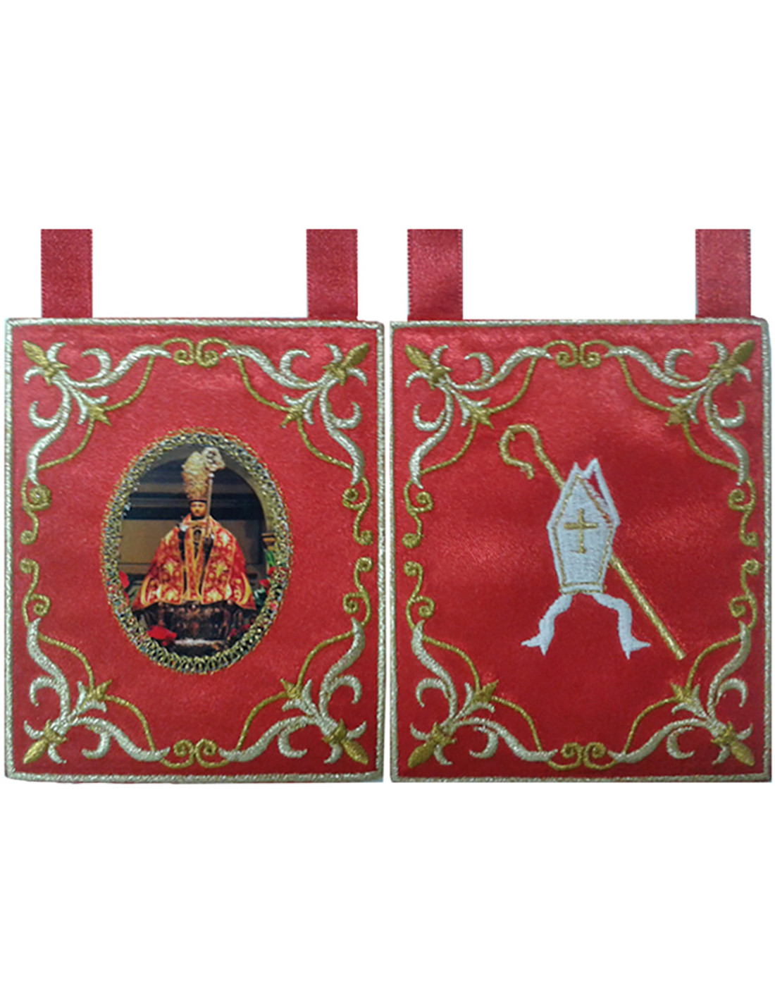 ESCAPULARIO BORDADO A MÁQUINA SOBRE TEJIDO DE RASO ROJO, CON HILOS METÁLICOS DORADOS Y VALO IMPRESO DE SAN FERMÍN Y SIMBOLOGÍA DEL SANTO BORDADA.